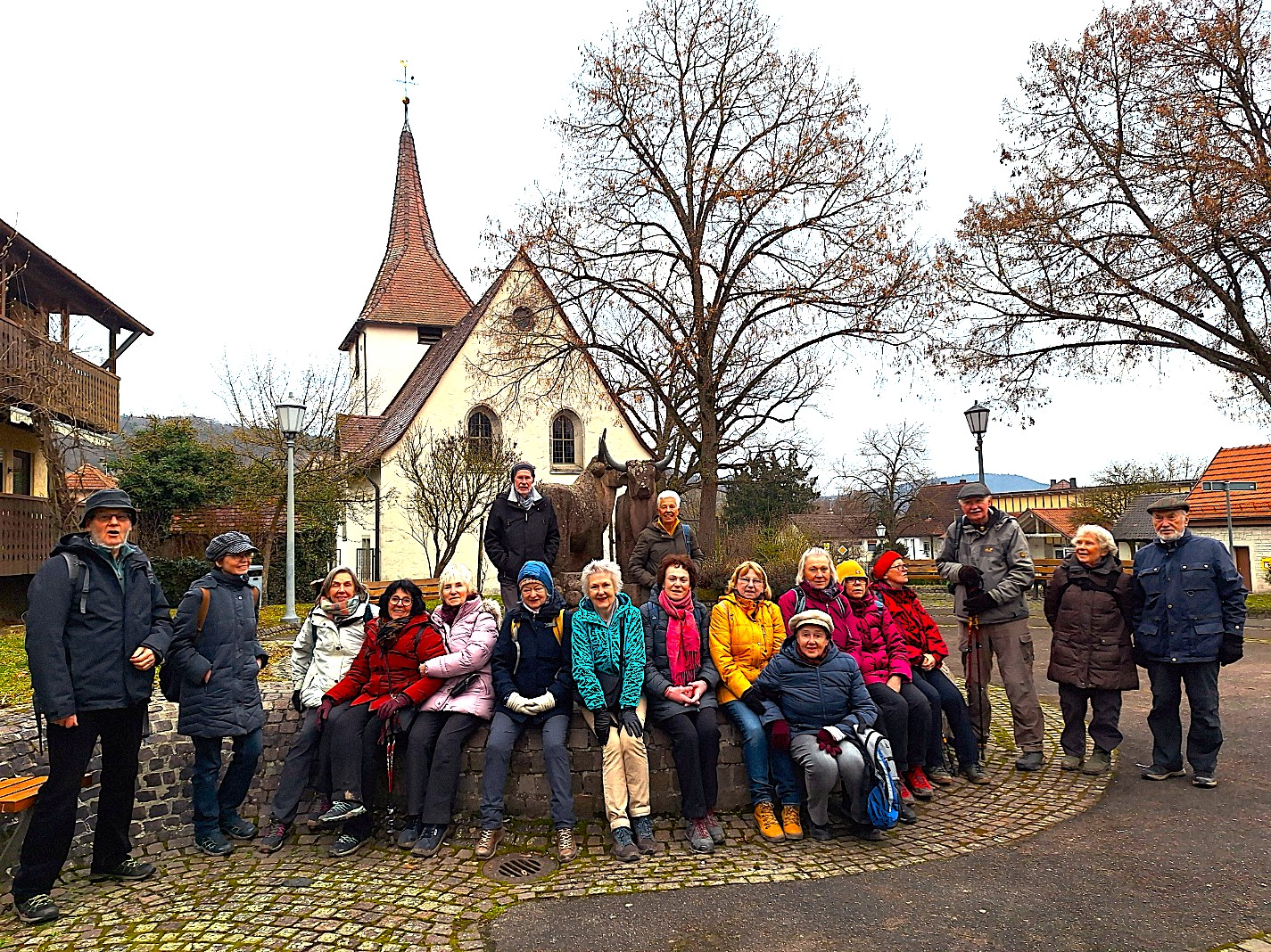 Ziel unserer Wanderung war der Höhenweg über dem Kirbachtal. Ein verbindendes Element ist der Sachsenheimer Weg von Häfnerhaslach über Ochsenbach- Spielberg- Kleinsachsenheim- Großsachsenheim. 23 Wanderer aus Markgröningen, Tamm, Marbach und Asperg fuhren mit Öffenlichen zum Startpunkt Badbrunnen in Häfnerhaslach, wo sie schon vom Vorsitzenden der dortigen Ortsgruppe erwartet wurden. Er berichtete über Aktuelles und aus der Historie des Dorfes beim anschließenden Rundgang. Der Name Häfnerhaslach taucht zum ersten Mal 1403 in einer Urkunde auf und deutet auf das Häfnerhandwerk hin, das hier ehemals von 100 Handwerkern ausgeübt wurde. Die Gemeinde gehörte zum Kloster Kirbach. Das Pfarrhaus war einst ein Beginenkloster. Die neu renovierte Remigiuskirche hebt sich heute von den andern historischen Gebäuden positiv ab, an denen der Zahn der Zeit nagt und die wegen Kapitalmangel nicht renoviert, sondern abgestützt und mit Metallbändern zusammengehalten werden. Ein Hingucker ist die ehemalige, voll funktionsfähige Kirchturmuhr, zu bestaunen in einem ebenerdigen Glashaus unterhalb der Kirche.