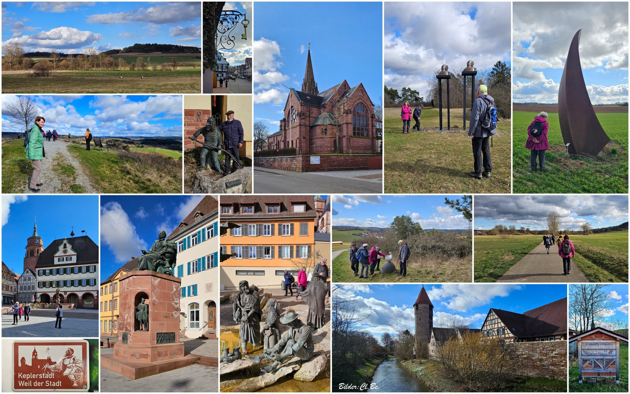 22 Wanderer machten sich auf den Weg „Rund um Weil der Stadt“. Zunächst ging es zum Marktplatz. Hier besichtigten wir das Denkmal des Astronomen Kepler, der 1571 hier geboren wurde, den Marktbrunnen mit Löwen und Adlerschild, das als Zeichen des Status der Reichsstadt und den oberen Marktbrunnen mit dem Standbild Kaiser Karl V. Einen Fotostopp machten wir am Narrenbrunnen und weiter ging unser Weg am ehemaligen Spital vorbei. Wir wanderten auf dem Skulpturenpfad über die Höhen des Heckengäus. Unsere Rast auf der Höhe bescherte uns einen wunderschönen Ausblick auf das gesamte Umland. Danach ging es abwärts nach Malmsheim, ansteigend in Richtung Heidehöfe. Wir wanderten auf der Hochfläche immer mit Blick auf Weil der Stadt nach Merklingen, wo wir einkehrten. Gestärkt machten wir uns auf den Rückweg, vorbei am Merklinger Ried und erreichten nach 3 km die S-Bahn in Weil der Stadt. Herzlichen Dank an alle Mitwanderer, die sich mit uns auf den Weg gemacht haben.