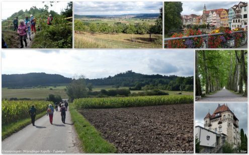 Bahn und Bus brachten die Wanderer verzögerungsfrei zu unserem Wanderstart nach Unterjesingen im Ammertal. Unser erstes Ziel im Blick, den Wurmlinger Kapellenberg, wanderten wir durch eine ebene Landschaft, bis der Weg durch Streuobstwiesen hindurch stetig anstieg. Schnell waren wir auf dem Sattel zwischen Kapellen- und Spitzberg. Der letzte Aufstieg zur Kapelle war nur noch eine Formsache. Oben angekommen, hatten wir eine wunderbare Rundumsicht. Leider war die Sicht in die Ferne etwas getrübt. Zurück auf dem Sattel machten wir eine erste größere Pause. Dann ging es über den Spitzberg, der eigentlich ein langer Höhenrücken ist, über Wald- und Traufwege mit schönem Ausblick zum Ludwig-Uhland-Weg. Dieser Weg, mit Gedichttafeln versehen, führte uns nach Tübingen. Unterwegs verbesserte sich die Fernsicht, und wir konnten die Hohenzollernburg bei Hechingen erkennen. Bei den ersten Häusern von Tübingen verließen wir den Weg und gingen über eine Staffel hinunter zum Neckar. Auf der Neckarinsel mit Blick auf Schloss Hohentübingen und die Altstadt von Tübingen erreichten wir unser letztes Ziel, eine Brauereiwirtschaft am Ufer. Nach gutem Essen und Trinken brachte uns die Bahn wieder pünktlich nach Tamm zurück. Ein Dank an alle, die durch ihr mitwandern zu diesem schönen Tag beigetragen haben.