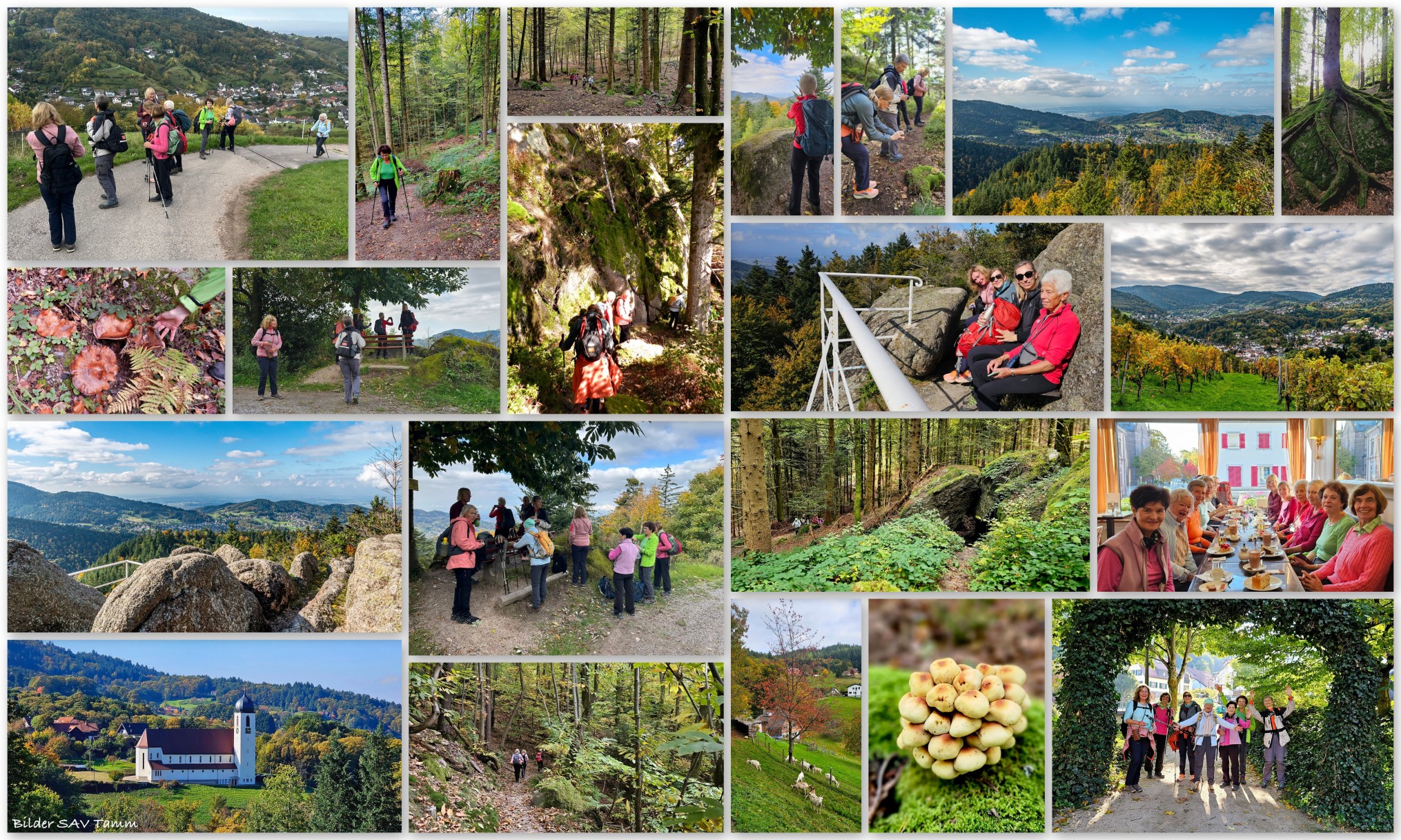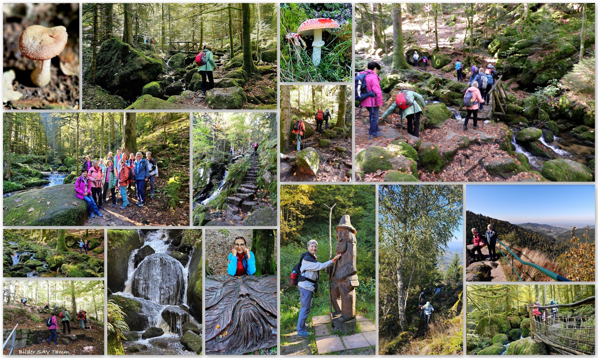 Strahlender Sonnenschein empfing in Bühlertal die 12 Damen aus Tamm. Frisch und gut ausgestattet mit bestem Schuhwerk und guter Laune starten wir den Gertelbachrundweg am Parkplatz Wiedenbach. Der Einstieg in die eigentliche Schlucht kam nach einem Kilometer und alle bestaunten diese herrliche Natur. Auf den knapp drei Kilometern durch die Schlucht wurden wir stets von Bachrauschen begleitet. Urige Pfade, Brücken, Stege, Felsbrocken – all das konnten wir erleben. Das Sonnenlicht ließ die herbstlich verfärbten Bäume strahlen. Mit knapp 300 Höhenmetern und zahlreichen rutschigen Stellen war der Weg anspruchsvoll. Einige weitere Höhenmeter ging es hoch zur Aussichtsplattform, dem Wiedenfelsen auf 700 Hm. Eine traumhaft schöne Aussicht genossen wir über den nördlichen Schwarzwald bis ins Rheinland und zu den Vogesen bei sommerlichen Temperaturen. Nach der Vesper ging es durch den Wald zum Sickenwalder Horn. Noch einmal ein paar Höhenmeter und ein weiterer Ausblick erwarteten die Wanderinnen auf 760 Metern Höhe auf der Felsformation. Von da ab ging es nur noch abwärts. Nach 10.5 km und 370 Höhenmetern und vielen schönen Eindrücken bezogen wir unser Hotel „Grüner Baum“. Ein fabelhaftes Abendessen schloss diesen Wandertag ab.